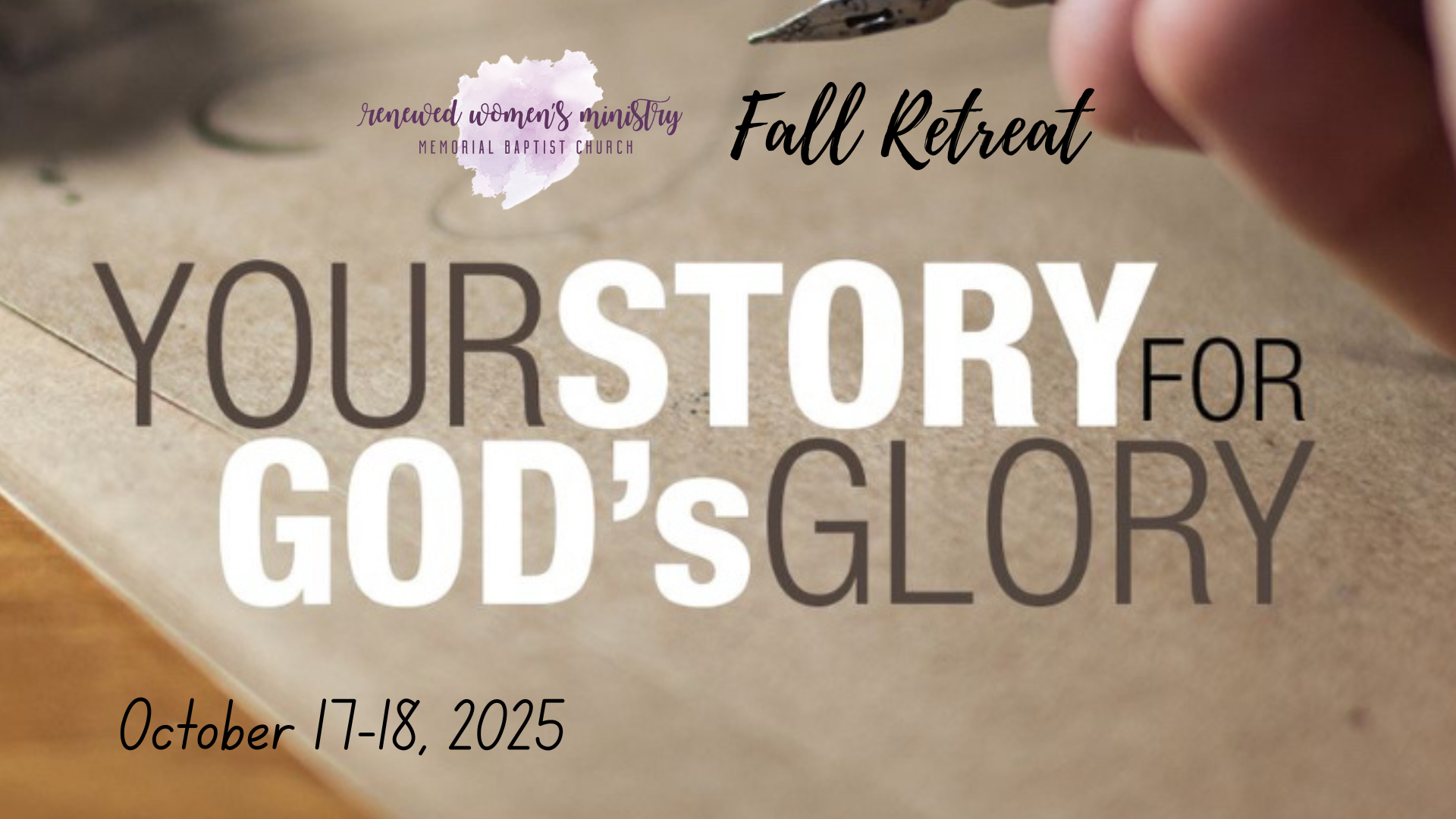 Ladies, we invite you to join us for our annual retreat on October 17th and 18th at Summers Mill Retreat & Conference Center. This is a great time to get away and unwind from the chaos of life. Our theme this year is "Your Story for His Glory" from Revelation 12:11 and our speaker is Ashley Smalley. Come and join us Friday from 6-9 for $50, Saturday from 8:30-3:30 for $75, or come to both events Friday and Saturday for $125. If you would like to come to both events and stay at Summers Mill, you can for $150. There are limited spots available so sign up soon!