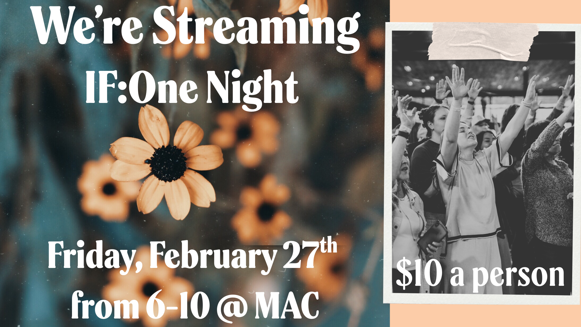 • Ladies, join us Friday, February 27th for our If: One Night gathering. This is a wonderful time of worship, teaching, and community! This is for all ladies 14 and up. Bring your mom, sister, grandma, or friend and join us for this event. The cost is $10 a person and you can sign up now by clicking the image above.