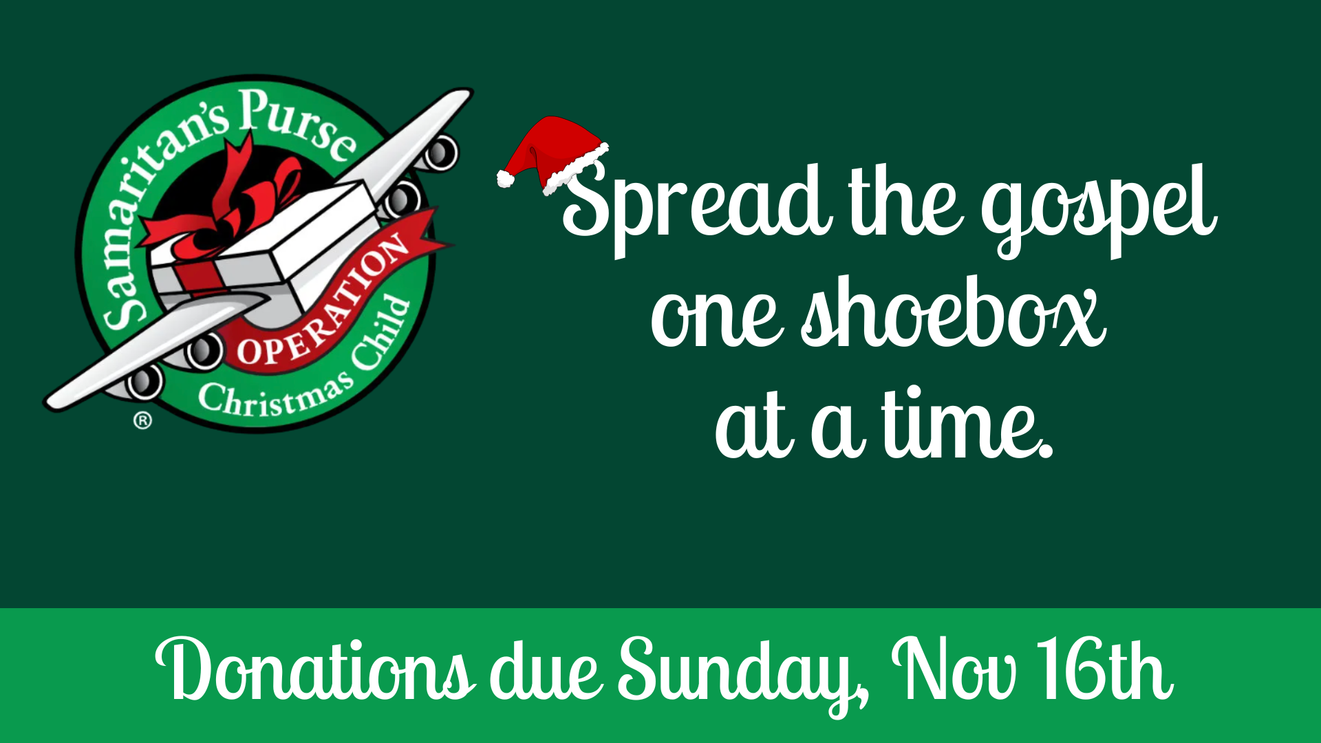 • Operation Christmas child is an international organization that delivers Christmas gifts to children around the world. The organization also spreads the gospel with these children and their families. Stop by the back foyer or the church office, to pick up a Christmas shoebox, fill it up with children gifts, and bring it back by Sunday, November 16th.