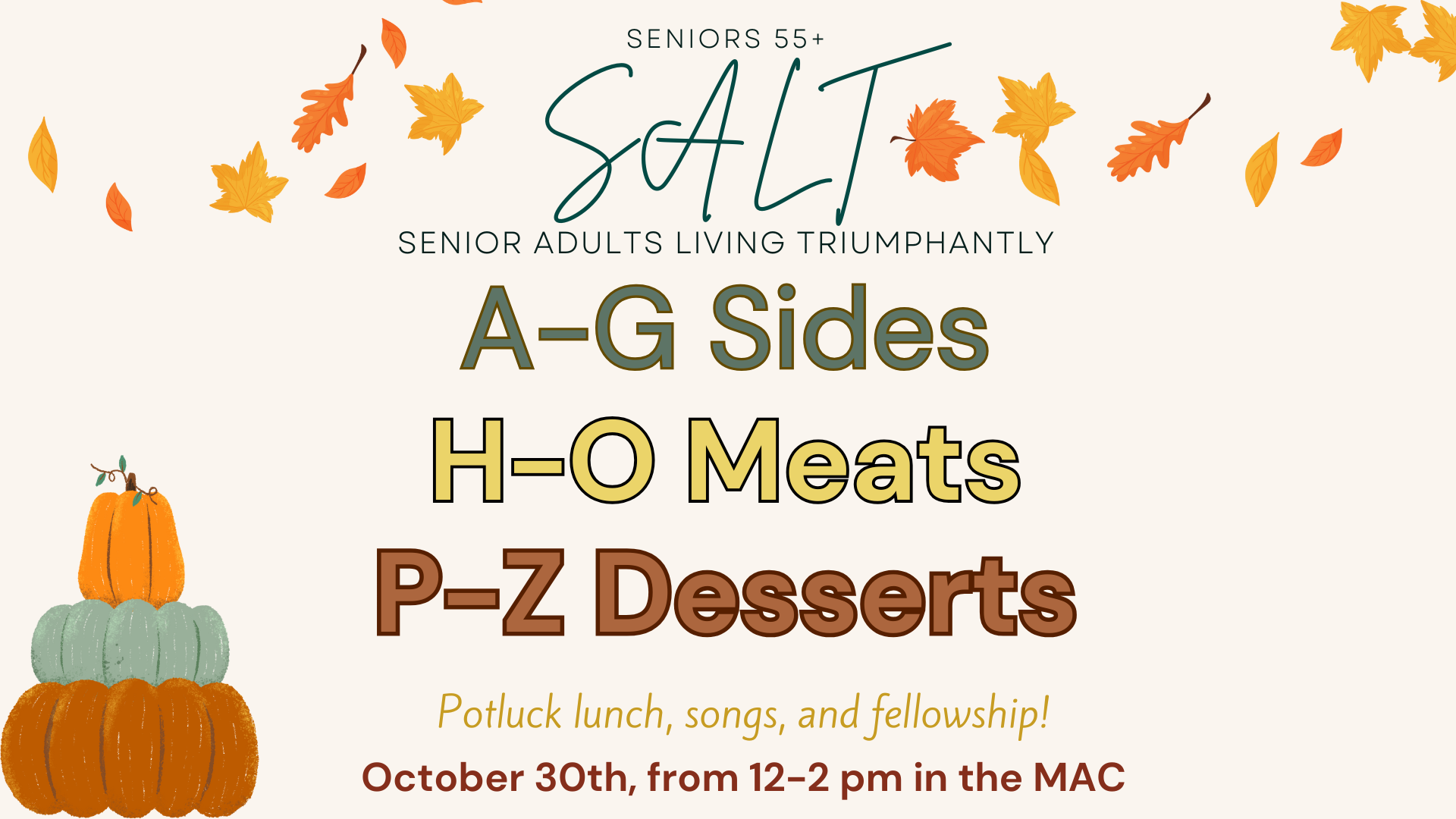 • If you are a senior adult (55+) we would love to invite you to join us for our SALT Senior luncheon and fellowship. Come enjoy a wonderful time of community with us Thursday October 30th from 12:00-2:00. If you have questions or would like more information please contact the church office or send us an email.