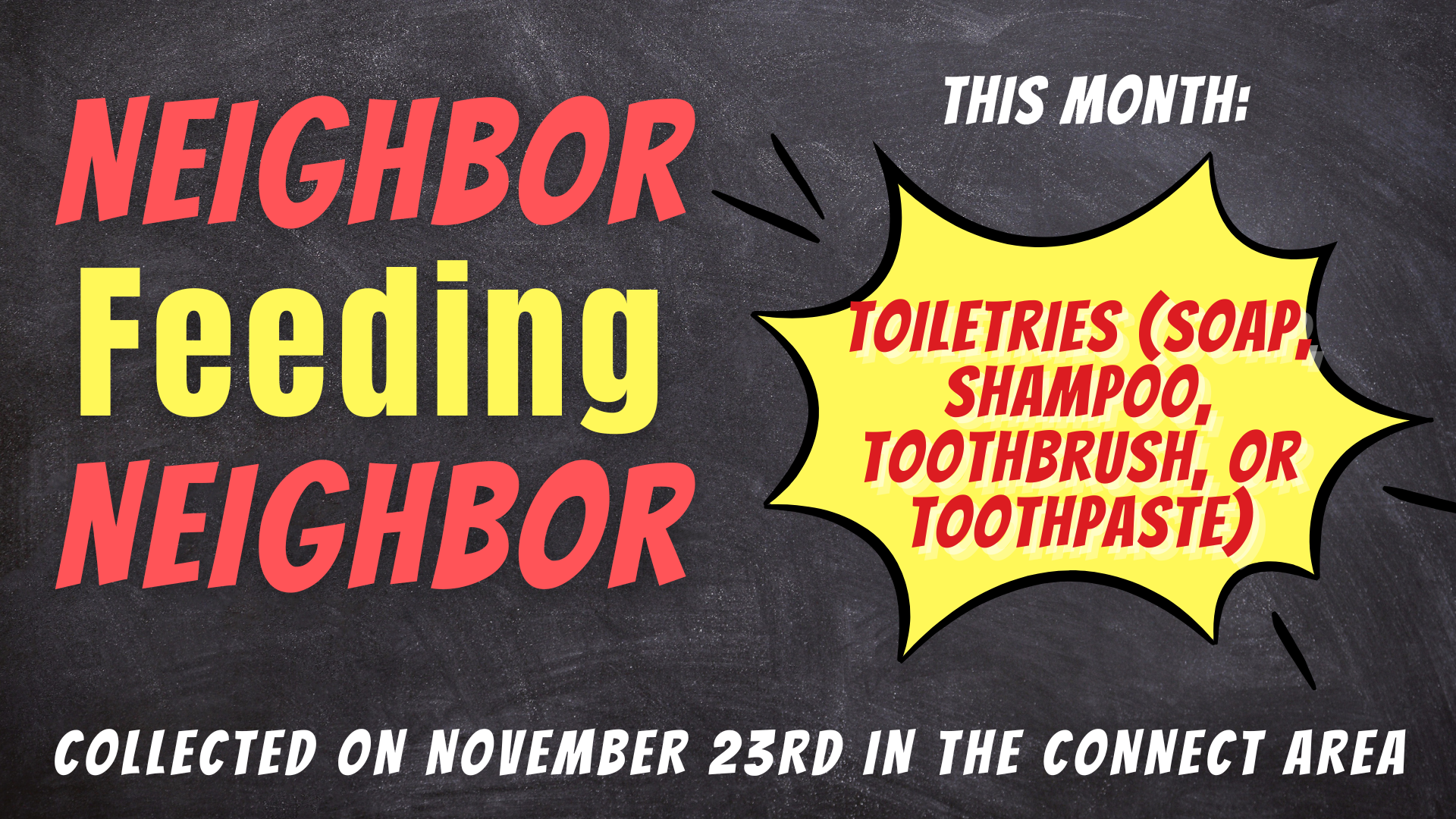 • This month for neighbor feeding neighbor we are asking for toiletries items such as soap, shampoo, toothbrushes, or toothpaste. Please drop off your donations to the connect desk by the 4th Sunday.