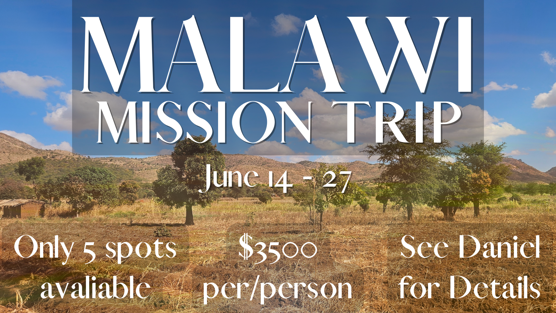 • This summer come serve others in our Malawi Mission Trip. This will be June 14th-27th. You will need your passport in order to go. There are only 5 spots available, so if you are interested, please Click on the image above email Daniel at daniel@membc.org.